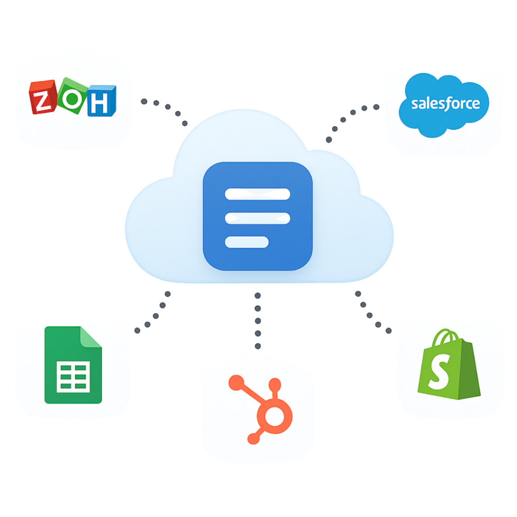CRM & Marketplace Integration — Sync with platforms like Zoho, Salesforce, Shopify, and more